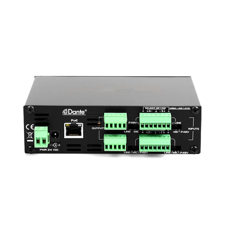 4 mikrofoni ja liinisisendid Dante -liides on professionaalne heliliides, mis põhineb Dante võrguprotokollil, toetades 4 mikrofoni/rea sisendit ja 4 väljundit. Selle põhieeliseks on edastada kvaliteetseid, madala latentsusajaga helisignaali IP-võrkude kaudu, mis sobib stsenaariumide jaoks, mis nõuavad paindlikku juhtmestikku, kaugülekannet või mitme kanaliga heli integreerimist. See sobib elava heli, maanteeülekande/voogesituse tootmiseks, konverentsisüsteemi, hariduslikud kohad ja nii edasi.